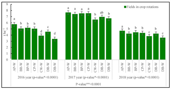 Yield of wheat grain (t·ha−1). Abbreviations: * p-value for fields in crop rotations, ** p-value for years; AP-W—crop rotation A, forecrop pea; BR-W—crop rotation B, forecrop rape; BP-W—crop rotation B, forecrop pea; CP-W—crop rotation C, forecrop pea; CW-W—crop rotation C, forecrop wheat; DR-W—crop rotation D, forecrop rape; DB-W—crop rotation D, forecrop barley. Different letters indicate significant differences between fields in crop rotation (p < 0.05); n = 4.