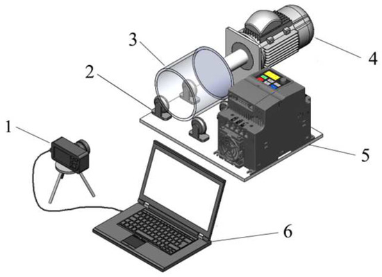 The dynamic angle of repose test device. 1, high-frame-rate camera; 2, bracket wheel; 3, drum; 4, motor; 5, frequency converter; 6, computer.