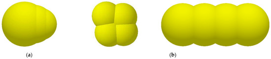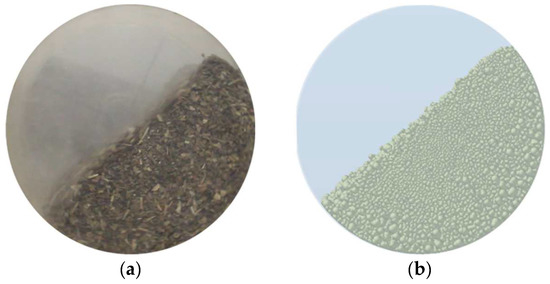 Relevant studies have shown that the shape characteristics of particles have a significant impact on the test results. The contour of the materials indicate that the particles have different shapes and dimensions. Therefore, in order to establish an accurate particle model and to reduce the contour difference between simulated particles and actual particles, a number of staggered stacked spherical particles with different diameters were used to build the geometric models of soil (Figure 4a) and cotton residue (Figure 4b), respectively. To ensure the accuracy of the simulation results and to improve the simulation efficiency, the particle size of the material particle model generated in EDEM was randomly distributed within the range of 0.8~1.2 times the size of the basic particle unit of the non-standard ball, according to the size distribution range measured in the test.