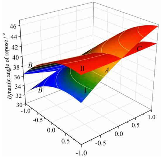 The design and results of the response surface test are shown in Table 9. A mathematical model between the dynamic angle of repose σ and the three significance parameters were established using Design-Expert software, as is shown in Equation (5):