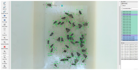 The captured images are then processed, and target objects are identified and labelled (annotated) with bounding boxes in the LabelImg program (Figure 7). In order to define the ground truth, image labelling was performed by an entomologist expert.