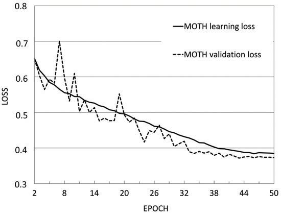 The statistical indicators calculated during the learning and validation of the model are shown in Figure 8. The learning and validation losses reduced and stabilised at a specific point (Figure 8), suggesting that the model is optimally fitted and that no further adjustments are required.