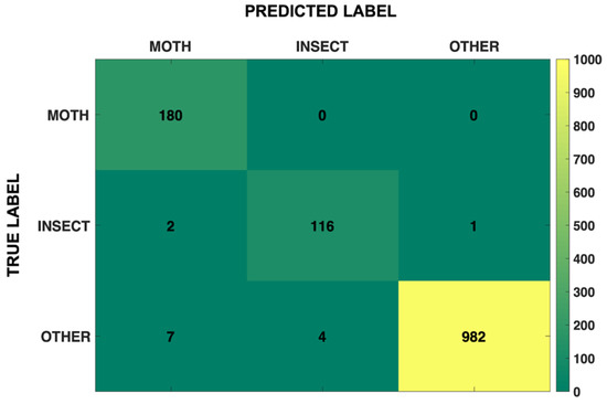 Taking into account the number of actual values and those predicted by the model, there were no FP detections (Figure 10), indicating that the model detected the class MOTH completely precise (1.0) (Table 5). The recall for the class MOTH was 0.95, indicating a high proportion of correctly predicted moths relative to all positive observations. Given that the F1 score is a weighted average of precision and recall [69], the F1 score data were, as expected, slightly below 1.0 (Table 5). The detection accuracy for the other two classes (INSECT and OTHER) was also very high (>99%). In addition, all other detection parameters (precision, recall, and F1 score) for the class INSECT were 0.97. Thanks to the higher number of TP detections (Figure 10), the class OTHER had slightly higher parameters, where recall was 1.0, while precision and F1 score were 0.99 (Table 5).