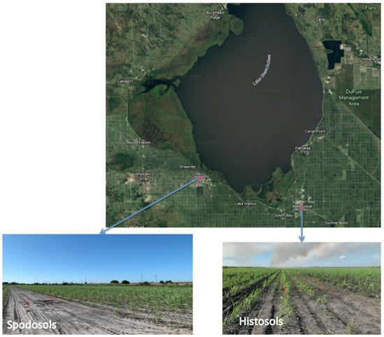 Sugarcane (Saccharum officinarum) is one of the most extensively grown row crops planted on approximately 1600 km2 in South Florida [1]. Approximately 71.1% of the crop is grown on Histosols in the Everglades Agricultural Area in 2020/21, while the remaining occurs on mineral soils, mainly Entisols, Alfisols, and Spodosols [1,2]. Since all available land on these Florida Histosols are used for crop production, there is an increasing trend toward expanding sugarcane production to mineral soils. Most Histosols have low mineral content, with limestone as the bedrock under the organic soil layer [3]. Additional N fertilizer is not recommended for sugarcane production on these organic soils, but P and K fertilizers are recommended [3,4,5]. However, for sugarcane production on mineral soils, nutrient deficiencies are a major concern due to the low organic matter (OM) content and poor nutrient holding capacity. Currently, growers rely on large amounts and frequent fertilizer applications to achieve an acceptable sugarcane yield on mineral soils.