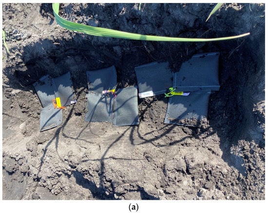 In order to examine the decomposition of bagasse buried in soils or on the soil surface, a mesh bag technique [14,15,19] was used (shown in Figure 2a,b). Window screen (Charcoal Super Solar Screen, 2 mm mesh size) was used to make mesh bags that were 10 cm × 15 cm. Fresh bagasse was air-dried until it reached a constant weight and sieved using the window screen to retain the relatively large size of this material. Approximately 10 g of dry bagasse was weighed and placed in mesh bags, and then the bags were sealed using a heat sealer. There were three replications for each soil depth and each soil type in each cropping system for each retrieval date.