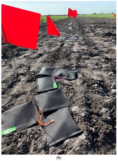 (a). Mesh bags buried at 15 cm under soil surface. (b). Mesh bags placed on the soil surface. A randomized complete block design was used for each soil depth in sugarcane and fallow fields on both Histosols and Spodosols. All bags were installed in the fields approximately 5–7 weeks after sugarcane was planted on two soil types (3 November 2020 on Spodosols; 20 January 2021 on Histosols). Sugarcane received standard chemical fertilizers based on recommendations for commercial sugarcane production in South Florida over the entire period of the current study. Daily temperature and precipitation throughout the experiment were shown in Figure 3a,b (Florida Automated Weather Network Data).