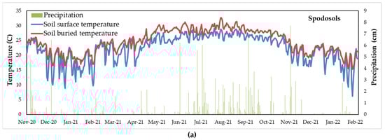 For the Spodosols, daily soil surface temperatures ranged from 6.14 °C to 29.08 °C, while soil temperatures below the soil surface ranged from 15.24 °C to 32.7 °C during the study period. Soil surface temperature had more fluctuations, as shown in Figure 3. Rainfall was concentrated during the rainy season in Florida, from June to November.