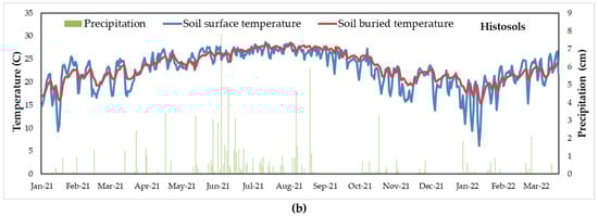 For the Histosols, daily soil surface temperature ranged from 6.1 °C to 28.72 °C, while soil temperature below the soil surface ranged from 15.37 °C to 28.39 °C during the study period. Rainfall events occurred mainly from June to October.