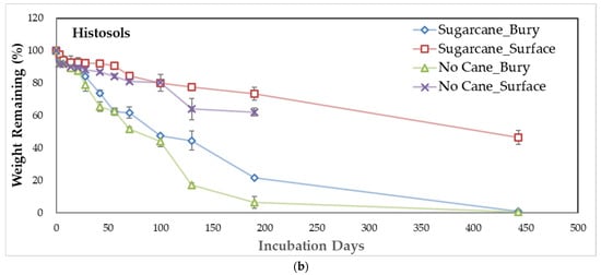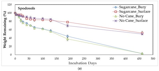 The results of the dry matter loss experiments suggested that bagasse decomposed faster when it was buried instead of placed on the surface, regardless of soil type and whether it was in a sugarcane production system or a fallow field. One previous study reported that three types of cover crops, including forage radish (Raphanus sativus L.), winter pea (Pisum sativum subsp. Arvense L.), and cereal rye (Secale cereale L.), had faster residue decomposition when buried in the soil [14]. Another study also reported a similar result, as the rate of decomposition of cornstalk residue contained in bags on the soil surface was noticeably slower than that in bags buried in the soil. The faster decomposition of the buried bagasse likely resulted from the placement itself, as buried bags had twice the bagasse-soil contact [21]. A larger surface area was exposed to greater microbial activity, which may have accelerated decomposition [14]. The daily decomposition rate calculations indicated that bagasse decomposed faster in Histosols than in Spodosols. Although the decomposition experiments in Histosols and Spodosols began at different times, they occurred under similar climatic conditions, as shown in Figure 3a,b, and described in Section 3.1. Therefore, climate variables may not be dominant factors affecting bagasse decomposition, while differences between bagasse decomposition rates in Spodosols and Histosols are likely primarily due to differences in the microbial biomass and activities of these two soil types. Histosols may have higher microbial biomass and activity than Spodosols because of the higher soil OM (35.89 ± 7.07, n = 16 compared to 2.72 ± 0.21, n = 16) in our study. Both microbial biomass and activities can have a significant positive correlation with soil OM [22].