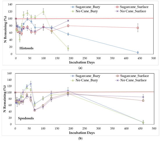 (a). N remaining (%) in bagasse during the experiment in Spodosols. (b). N remaining (%) in bagasse during the experiment in Histosols.