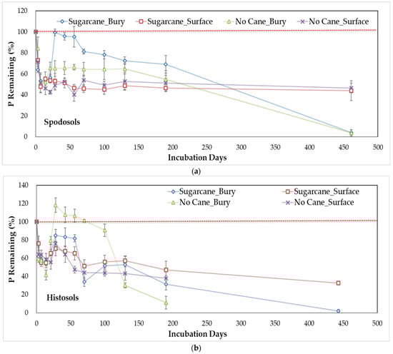 (a). P remaining (%) in bagasse during the experiment in Spodosols. (b). P remaining (%) in bagasse during the experiment in Histosols.