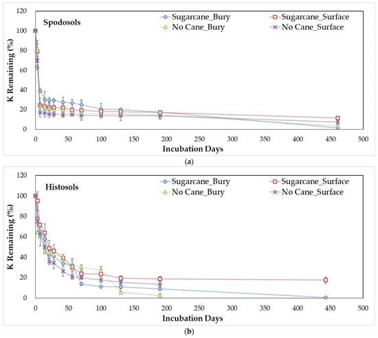 (a). K remaining (%) in bagasse during the experiment in Spodosols. (b). K remaining (%) in bagasse during the experiment in Histosols.