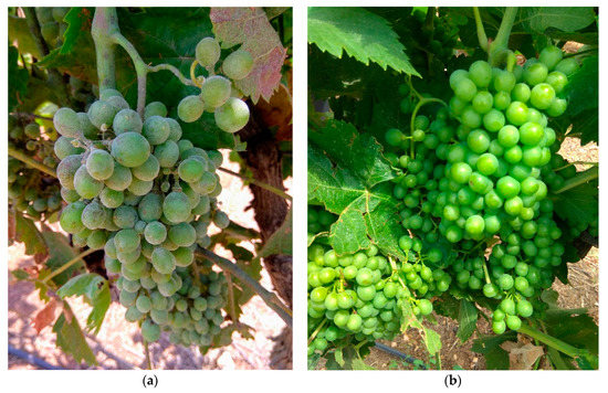 The first trial was carried out in the Cacachopal Valley region of Requinoa using the cultivar “Crimson Seedless”© table grapes grown using the Spanish trellis system, with spacing between the rows and vines of 3.5 × 2 m. The climate is warm temperate with winter rains and a prolonged dry season (7 to 8 months), with Mediterranean characteristics (hot and dry summers and rainy, cool, and humid winters) and an annual rainfall of 350–400 mm. A total of 6 foliar sprays were applied, with an average spray volume of 1200 L/ha, at 10-day intervals from 27 November 2017 (BBCH 69) until 16 January 2018 (BBCH 80). The second trial was carried out in the Casablanca Valley using the cultivar “Chardonnay”© wine grapes grown using the Double Guyot system, with spacing between the rows and vines of 2.5 × 1.5 m. The climate conditions are characterized as a cool Mediterranean climate, with pronounced maritime influence and an annual rainfall of 300 mm. A total of 5 foliar sprays were applied at average spray volumes of 600 L/ha at 14-day intervals from 30 November 2017 (BBCH 69) until 25 January 2018 (BBCH 80). Unsprayed vines served as the control. The foliar sprays for both trials were performed using a Maruyama MS073D gun sprayer (pressure 20 bar) (Chiyoda-ku, Tokyo, Japan).