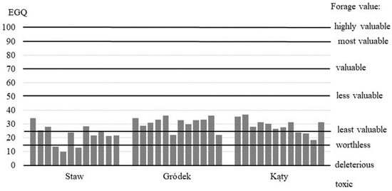 The evaluation of grassland quality (EGQ) according to Novák et al. [] showed that the value of biomass from the analysed grasslands was very low. The biomass values most often ranged between less and least valuable (Figure 1). This demonstrates the difficult nutritional conditions for grazing sheep.