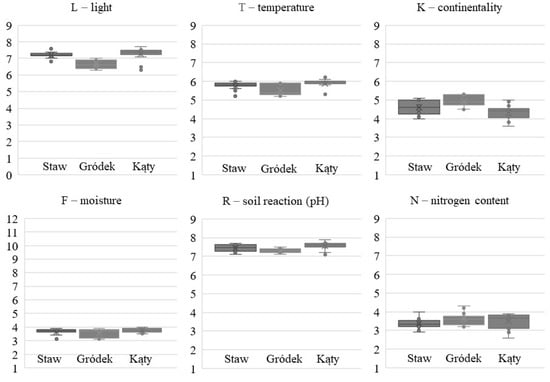 The analysed areas were characterised by diverse habitat conditions (Figure 2) determined on the basis of plant species and ecological indicators by Ellenberg et al. []. The greatest diversity was observed in Staw due to the mosaic of communities of xerothermic grasslands and thermophilic shrubs.