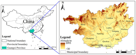 Guangxi Province is located in the southern region of China, between 104°28′~112°04′ E and 20°54′~26°23′ N, bordering Guangdong Province to the east, facing the Beibu Gulf to the south and across the sea from Hainan Island, adjacent to Yunnan Province to the west, connected to Hunan Province to the northeast, and bordering Guizhou Province to the northwest [15]. It is located at a low latitude and a large north–south latitude, with significant climate differences across the region [16]. It belongs to the subtropical and tropical monsoon climate zone of Central and South Asia, with an average annual temperature of 16.5–23.1 °C, an average annual precipitation of 1000–2800 mm, and an average annual sunshine duration of 1169–2219 h [17]. The unique climate provides favorable conditions for the cultivation of various crops such as sugarcane, citrus, bananas, and rice. Sugarcane is the main economic crop in Guangxi Province and the main source of income for farmers [18]. Guangxi Province is mainly composed of different types of landforms, such as mountains, hills, tablelands, and plains. The central and southern parts of Guangxi Province are mainly hilly and flat land, with a basin-like shape, and are known as the “Guangxi Basin”. Under the combined influence of solar radiation, atmospheric circulation, and geographic environment, Guangxi Province has formed a climate characterized by distinct dry and wet seasons, moderate sunshine, few winters and many summers, frequent disasters, and prominent droughts and floods, with abundant wind energy resources along the coast and in the mountains [19]. The scope of this study covers the whole of Guangxi Province, China, as shown in Figure 1.