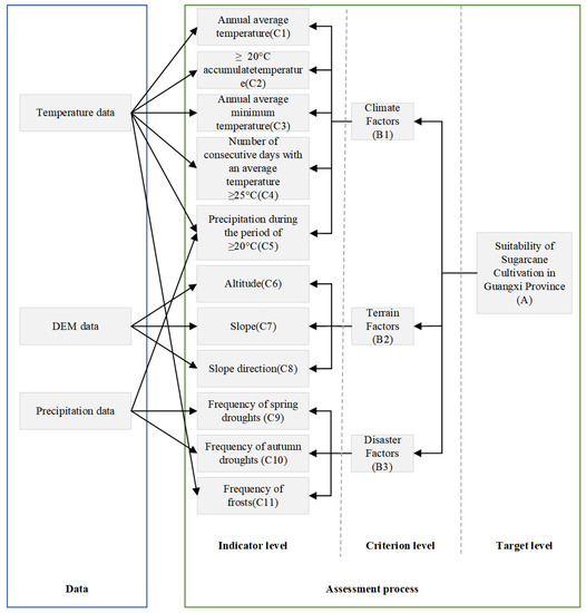 The growth of sugarcane is affected by various factors, including climate, terrain, and disasters. Climatic factors such as precipitation, temperature, light, and humidity have a significant impact on the growth rate of sugarcane, photosynthesis efficiency, and incidence of pests and diseases [12,14,20,21,22,23,24,25,26,27]. Terrain factors such as altitude, soil texture, slope, slope direction, and soil moisture have a direct impact on the growing environment, soil quality, and water supply of sugarcane [10,11,12,28,29]. Disaster factors such as drought, flood, freeze, pests, and diseases have a direct impact on sugarcane yield and quality [13,30,31,32,33,34]. Among them, annual average temperature [20,21,22,23,24,25] can reflect the temperature conditions throughout the growing season, and annual average minimum temperature [20,23,25] reflects the sensitivity of sugarcane to low temperature. The ≥20 °C accumulated temperature [20,21,22,23,25,26,27] reflects the effective temperature obtained by sugarcane during the growing season [35], and the number of consecutive days with average temperature ≥25 °C [20,25,27] reflects the influence of high temperature on sugarcane growth. Precipitation during the period of ≥20 °C [20,24,25] reflects the influence of water on sugarcane during the growing season. Altitude [11,28] reflects the influence of height difference on sugarcane growth, and slope [10,11,29] reflects the influence of slope gradient on water and soil nutrients. Slope direction [11,28] reflects the influence of slope orientation on sunlight and temperature. Spring drought [13,30,31,32] reflects the cultivation and emergence situation of spring sugarcane, and autumn drought [13,30,31,32] reflects the elongation and sugar accumulation situation of sugarcane in the later stage. Frost [13,33,34] reflects the influence of low-temperature environments on sugarcane. The frequency of disasters can more comprehensively reflect the occurrence of disasters in the region and is more representative and operational [36]. These indicators consider sugarcane growth from different perspectives. Comprehensive consideration can more accurately reflect the growth status of sugarcane. Therefore, in this paper, these 11 indicators have been used as indicators for assessing the suitability of sugarcane.