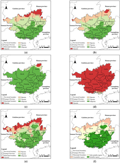 Based on the sugarcane cultivation suitability assessment system, the climate factor of sugarcane cultivation suitability in Guangxi Province was assessed. Firstly, the suitability score maps of five indicators were obtained (Figure 3a–e). By considering the weights of each indicator, the assessment score data of sugarcane cultivation suitability in Guangxi Province were obtained based on the climatic factor. Finally, the assessment score data were divided into different levels according to the classification standard for sugarcane cultivation suitability to obtain the assessment results (Figure 3f).
