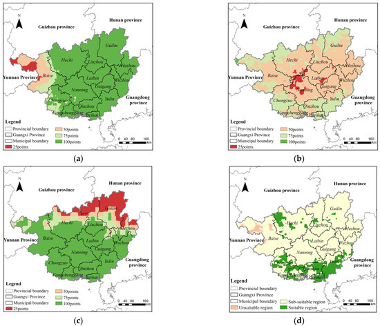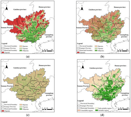 Based on the sugarcane cultivation suitability assessment system, the disaster factor of sugarcane cultivation suitability in Guangxi Province was assessed. First, the map of suitability scores of three indicators were obtained (Figure 5a–c). By considering the weights of each indicator, the assessment score data of sugarcane cultivation suitability in Guangxi Province were obtained based on the disaster factor. Finally, the assessment score data were divided into different levels according to the classification standard for sugarcane cultivation suitability to obtain the assessment results (Figure 5d).