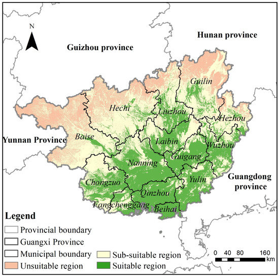 Analysis of Figure 6 shows that 37% of Guangxi Province’s entire area is suitable for sugarcane cultivation, with an area of 8.732 million hectares mainly distributed in the southern and central regions including Qinzhou City, Beihai City, Chongzuo City, Nanning City, Laibin City, Guigang City, and Yulin City. Additionally, 44% of Guangxi Province’s entire area is moderately suitable for sugarcane cultivation, mainly scattered in the central and northern regions, as well as the eastern edge regions, including places such as Baise City, Hechi City, Liuzhou City, and Guilin City, covering an area of 10.292 million hectares. Only 19% of Guangxi Province’s total area is unsuitable for sugarcane cultivation, mainly concentrated in the northern part of Guangxi Province with an area of 4.628 million hectares. Overall, Guangxi Province gradually becomes more suitable for sugarcane cultivation from north to south, with Nanning City, Qinzhou City, Guigang City, Yulin City, Laibin City, and Chongzuo City being the regions with a relatively large suitable area for sugarcane cultivation, which should be areas of focus for the development of the sugarcane cultivation industry. On the other hand, many areas in the northern region are unsuitable for sugarcane cultivation, suggesting that other industries should be developed in these areas.