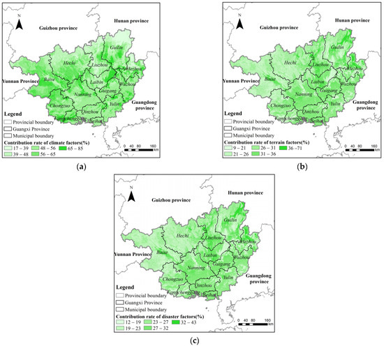Contribution rates of three factors to the assessment of sugarcane cultivation suitability: (a) contribution rate of climate factor; (b) contribution rate of terrain factor; (c) contribution rate of disaster factor.