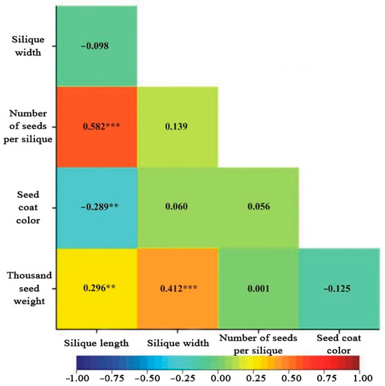 Heatmap for linear Pearson’s correlation coefficients between observed traits of Brassica napus. ** p < 0.01; *** p < 0.001.