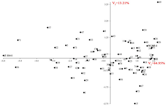 Using canonical variate analysis, the tested DH lines and their parental lines were characterized in terms of five quantitative traits. The first two canonical variates together explained 78.16% of the total variability between the individual genotypes, which means that there was a small loss of information. A similar value (72.55%) was observed by Bocianowski et al. [40], who analyzed rapeseed hybrids and their parental lines in terms of 19 traits. Both canonical variates were significantly positively correlated with the silique length and only the second with thousand-seed weight. The seed color had a significant negative impact on the first variate, and the silique width on the second one. The conducted canonical variate analysis allowed for the assessment of the distribution of objects in terms of their features in the space of the first two canonical variates. As the first variate explained a significant percentage of the observed variability (64.95%), as well as the correlation value between it and the seed color being very high (close to −1), the studied genotypes are arranged along the V1 axis in terms of this trait with high accuracy. Most of the studied DH lines were quite evenly distributed around the center of the coordinate system, while the parental lines were placed at the opposite ends of the V1 axis, which reflects the difference in the color of their seeds. Genotypes characterized by a light seed color and low thousand-seed weight are placed in the bottom left quarter of the coordinate system, and genotypes with light seeds but a higher TSW in the upper left part. In the upper right part of the graph there are genotypes characterized by darker and heavier seeds, and in the last quarter (bottom right), lines with dark seeds and a low thousand-seed weight are located. This arrangement of lines in the coordinate system facilitates the selection of genotypes with the desired characteristics. Two lines in the upper left quarter attract attention—DH 71 (color 4.4, TSW 5.5 g) and DH 57 (color 3.5, TSW 5.6 g). They have a similar color level, but a higher thousand-seed weight than the yellow-seeded parental line Z114 (color 4.75, TSW 4.85 g). The position of these two lines in the upper left quarter also indicates their potential for long siliques, as this feature is highly significantly correlated with the V2 variate (0.64).