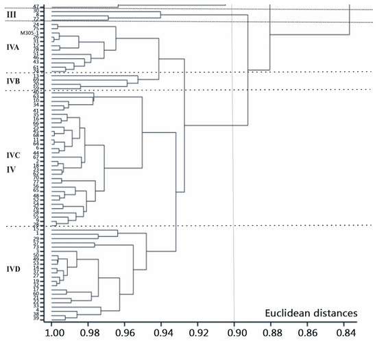 In the dendrogram presented in Figure 3, all the examined B. napus genotypes were divided into four groups as a result of agglomeration grouping using the Euclidean distance method. The first group (I) comprised two lines, DH 07 and DH 42, while the second one (II) consisted of five genotypes (DH 05, DH 36, DH 47, DH 71, and the yellow-seeded parental line Z114). The third group (III) contained three lines, DH 08, DH 30, and DH 72, while the fourth group (IV) contained the rest of the genotypes and was divided into four subgroups: IVA consisted of 11 DH lines (DH 12, DH 24, DH 26, DH 31, DH 43, DH 46, DH 51, DH 61, DH 74, DH 75, DH 78) and the black–seeded parental line M305; IVB, four DH lines (DH 13, DH 20, DH 59, DH 69); IVC, 32 DH lines; and IVD comprised 22 DH lines.