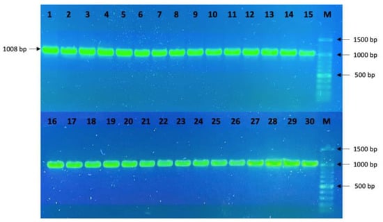 The electrophoregram of the target PCR products (1008 bp) belonging to Tsigai (lanes 1–10), Cluj Merino (lanes 11–20) and Tsurcana (lanes 21–30) breeds; M: 100 bp DNA ladder (O’RangeRuler 100 bp DNA ladder, Fermentas, Vilnius, Lithuania).
