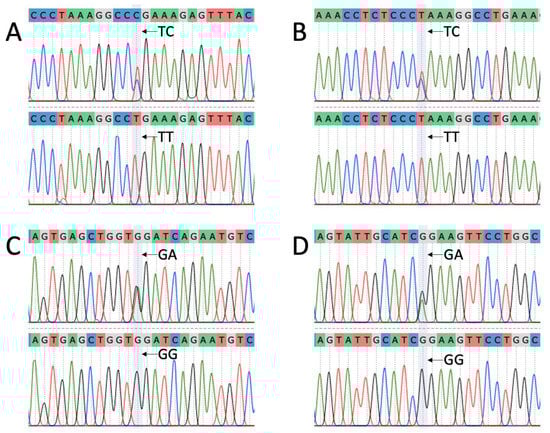 Sequencing electrophoregrams of the four structural variants found in ovine BMP15 gene: (A) c.755T>C substitution (T/C genotype, upper panel) and T/T wt genotype (lower panel); (B) c.747T>C substitution (T/C genotype, upper panel) and T/T wt genotype (lower panel); (C) c.1047G>A substitution (G/A genotype, upper panel) and G/G wt genotype (lower panel); (D) c.825G>A novel substitution mutation (G/A genotype, upper panel) and G/G wt genotype (lower panel). Images were generated with Unipro UGENE software (version 45.1).