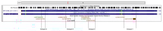 SNPs analysis was performed by interrogating the available literature and by identifying the corresponding point mutations within dedicated databases, such as NCBI (https://www.ncbi.nlm.nih.gov/ accessed on 23 January 2023) and Ensembl (http://www.ensembl.org/ accessed on 23 January 2023). In addition, we considered the mutations identified in our study, as well as those previously reported, in order to arbitrary delimitate putative mutational hotspots. The mutations coordinates were based on the coding DNA sequence and according to the X chromosome reference sequence.