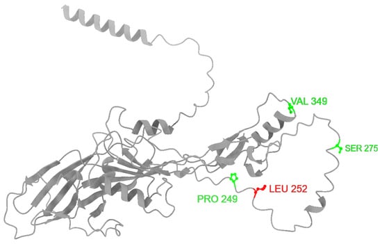 The missense mutation c.755T>C determines an amino acid substitution, p.L252P. Therefore, we investigated its possible effect on protein structure and biochemical properties. The secondary structure analysis revealed that the p.L252 amino acid was located in the near vicinity of an α-helix and a glycosylation site at position p.N237. The PAM250 matrix predicted a score of −3 for the substitution of L with P, a mutation that may decrease the protein’s hydrophobicity, which in turn might influence its normal folding, according to dedicated protein tertiary structure analysis tools, such as CUPSAT [53], DynaMut [54], INPS-3D [55] and MAESTROweb [56].