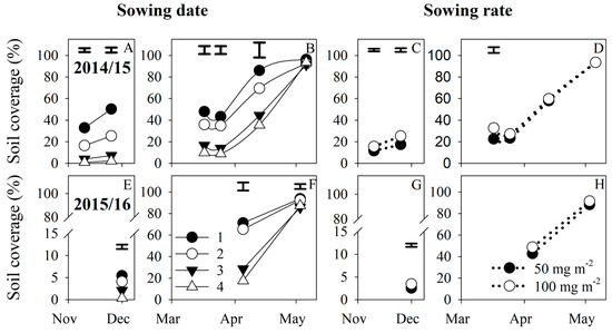 Soil coverage of winter poppy flower as affected by sowing date (sowing dates 1–4, ranging from early September to mid/end of October) and sowing rate in (A–D) 2014/15 and (E–H) 2015/16. Error bars are LSD (p < 0.05).