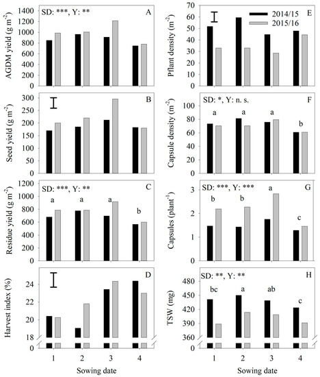 (A) Above-ground dry matter yield (AGDM), (B) seed yield, (C) residue yield, (D) harvest index, (E) plant density, (F) capsule density, (G) capsules plant−1 and (H) thousand seed weight (TSW) of winter poppy as affected by sowing date (ranging from early September to mid/end of October) and sowing rate in 2014/15 and 2015/16. SD = sowing date, Y = year. Significant effects at p < 0.05 (*), p < 0.01 (**) and p < 0.001 (***), n. s. = not significant. Error bars are LSD (p < 0.05). Different letters show significant differences between sowing dates (main effects).