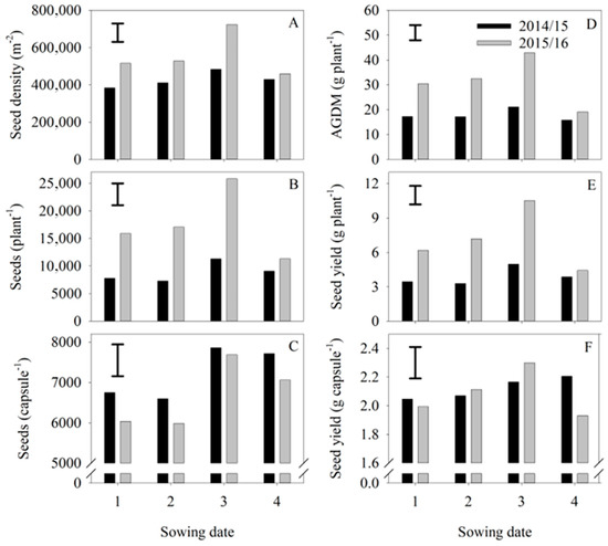 Seed density was ranked as follows: 3 ≥ 4, 2 ≥ 1 in 2014/15, and 3 > 1, 2, 4 in 2015/16. Seed density was higher for SD 1, 2 and 3 in 2015/16 compared to 2014/15 (Figure 3A). The number of seeds plant−1 did not differ between sowing dates in 2014/15 and was ranked in 2015/16 as follows: 3 > 2, 1 > 4. The number of seeds plant−1 was higher for SD 1, 2 and 3 in 2015/16 compared to 2014/15 (Figure 3B). The number of seeds capsule−1 was ranked as follows: 4, 3 > 1, 2 in 2014/15, and 3 > 4, 2, 1 in 2015/16. The number of seeds capsule−1 was higher for SD 1, 2 and 3 in 2015/16 compared to 2014/15 (Figure 3C).
