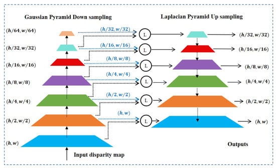where is the initial input image, and is the low-resolution image obtained by Gaussian down sampling (DS) on the scale. and are expressed as Gaussian DS and Gaussian US operations on image, respectively, and is expressed as the result of fusion of Gaussian images at two adjacent scales. By using this pyramid model, we down-sampled the input image from high to low resolution, using a Gaussian kernel to convolve the disparity map, remove the even-numbered items in the row and column, and obtain a new result map as input, which is passed to the lower layer in a similar way. To generate low-resolution results, we used Gaussian US from low-resolution to high-resolution, enlarged each low-resolution image to twice its input size, and then used Gaussian convolution kernel to convolute uniformly. Then, we subtracted adjacent layers to obtain disparity maps with six different scales.
