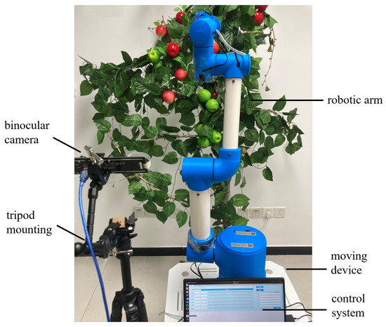 We conducted our experiments with a prototype of a harvesting robot. The robotic arm, moving device, binocular camera, and tripod mounting were rigidly connected, as shown in Figure 4. The binocular camera is responsible for capturing images and has the function of zooming.