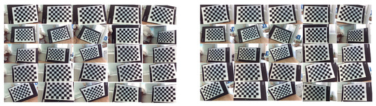 Our experiments used a zoom binocular camera as the image-acquiring device and used a black-and-white checkerboard as calibration target. The side length of each black and white square grid was 20 mm. Twenty-five pairs of images were captured by changing the position of the checkerboard, and the collected images are shown in Figure 5.