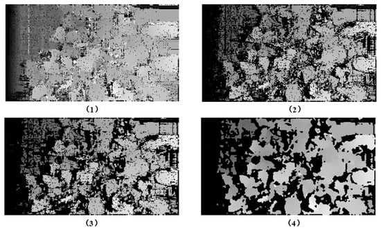 The acquisition of initial disparity map. (1) represents the disparity map achieved by SGM. (2) is the disparity map after the left–right consistency check processing. After removing the small connected regions, the result is presented in (3). (4) is the final disparity map obtained by median filtering.