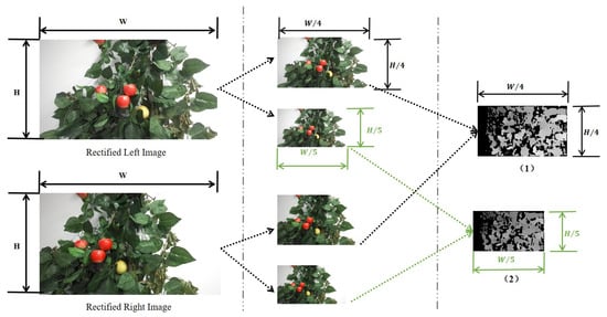 In order to obtain a high-precision initial disparity map and reduce the time cost at the same time, we down-sampled the rectified left and right images at different resolutions and achieved its corresponding OI disparity maps. The specific way is shown in Figure 8.