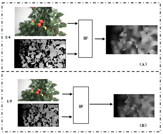where X is the pixel coordinate, and adjust the intensity and spatial similarity, respectively, and according to recommendations, the values of and are set to 10 and 30, respectively. The normalization parameter is . We use the original RGB low-resolution as the guiding image to filter the corresponding low-resolution disparity map, which obtains a disparity map in which the boundary region is well preserved.