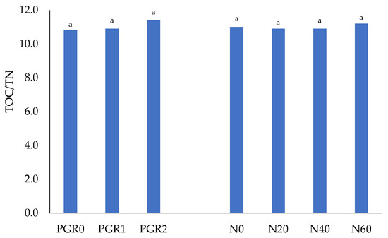 Mean values TOC/TN ratio for factors I (PGRs) and II (N dose). Plant growth retardant: PGR0—control; PGR1—chlormequat chloride (CCC) + trinexapac-ethyl (TE); PGRR2—chlormequat chloride (CCC) + ethephon (ET); N dose—nitrogen dose: N0, N20, N40, and N60 (0, 20, 40, and 60 kg N ha−1); a—significance of differences for factors.
