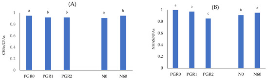 Mean values CHAs/CFAs (A) and NHAs/NFAs ratio (B) for factors I (PGRs) and II (N dose). Plant growth retardant: PGR0—control; PGR1—chlormequat chloride (CCC) + trinexapac-ethyl (TE); PGRR2—chlormequat chloride (CCC) + ethephon (ET); N dose—nitrogen dose: N0, N60 (0, 60 kg N ha−1); a–c—significance of differences for factors.