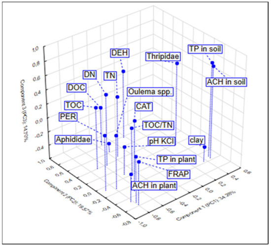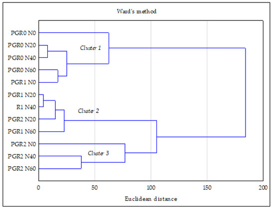 The obtained results were analysed statistically using the STATISTICA 13 software (Stat Soft Polska). A two-way (ANOVA) analysis of variance for the split-plot design was performed to determine the effect of plant growth retardants (I factor) and nitrogen doses (II factor) as well as the interaction (plant growth retardants × nitrogen doses) on the variation in the studied parameters in plant and soil, and the abundance of insects. The results were expressed as the arithmetic mean ± standard deviation (SD). Tukey’s post hoc test was applied to identify significant differences between the mean values. In order to better understand the relationship between the parameters under study, this study applied multivariate statistical methods: principal component analysis (PCA) and the cluster analysis (CA) method. PCA enables a reduction in the number of variables describing a particular object and an indication of the effect of the primary variables on the principal components as well as mutual correlations between the primary variables. The results of the analysis are provided in the form of a figure showing the characteristics in the arrangement of three initial principal components (PC1, PC2, and PC3), which represent the mutually correlated variables in a synthetic manner. CA enabled the separation of groups of objects based on the variation of variables [59].