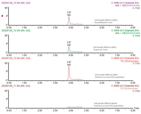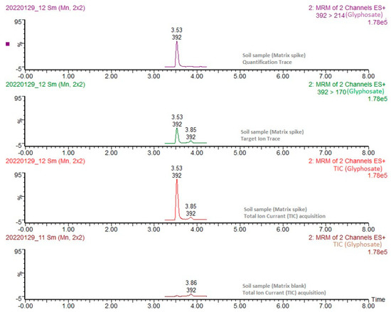 Internal quality control was performed with each analytical batch to verify that the established continuous system suitability specifications were met, as well as to demonstrate the accuracy and precision or other parameters determined for the method used in the determination. Two blank samples prepared as mentioned in the Stock Solutions and Spiked Samples Preparations section were analyzed; in the first, the determination was carried out directly while, in the second, a fortification was carried out with the analytes of interest at a concentration of 250 μg/kg. Blanks were evaluated and had to be below the LOD. In the case of the fortified blanks, the recovery of the glyphosate, AMPA, and glufosinate analytes was established. Accuracy, expressed as a percentage of recovery, should have been between 70 and 120% to ensure good quality control [49]. In this sense, the fortified blank samples showed recoveries of 95, 98, and 92% for Glyphosate, AMPA, and Glufosinate, respectively; in addition, the sample blank showed no interferences, demonstrating good performance.