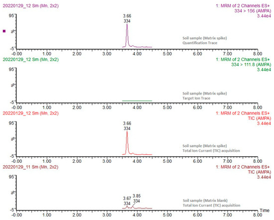 Under the optimized conditions, the proposed method demonstrated excellent selectivity for the target compounds. The UPLC-MS/MS can easily detect and quantify after derivatization, owing to the high selectivity of the technique of the resolution, rapid analysis, and low injection volume towards the organic compounds such as glyphosate, AMPA, and glufosinate. This was demonstrated with minimum signals or interference peaks in the chromatograms for the injected soil blanks; this indicates that the method was selective for the compounds of interest (Figure 1, Figure 2 and Figure 3 and Figures S1–S3).