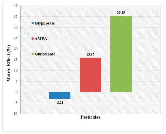 Matrix effect (ME %) for glyphosate, AMPA, and glufosinate by validated method.