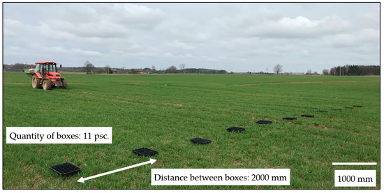 The tractor with the two spreaders tested had a throwing width of 20 m and a total theoretical fertilizer spread width of about 40 m. The amount of fertilizer spread and its uniformity were determined using special collection boxes that were 500 mm long, 400 mm wide, and 100 mm high. The distance between the centers of these boxes was 2 m, and a total of 11 of these boxes were used. The boxes were arranged in a single line, with the central box in the center of the tractor and spreader. The layout diagram of the boxes is shown in Figure 3. The amount of fertilizer accumulated in the boxes was weighed using a Kern PCB 1000-2 (Kern, Murnau, Germany) weighing scale with a unit value of 0.01 g.