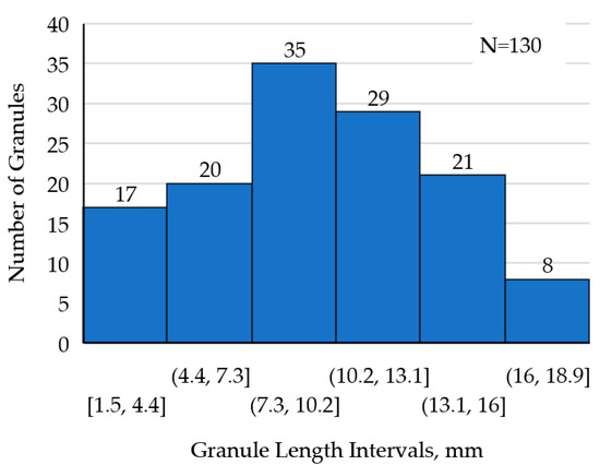 The histogram (Figure 4) and the plot chart (Figure 5) of the length distribution of 130 randomly sampled granules are presented.