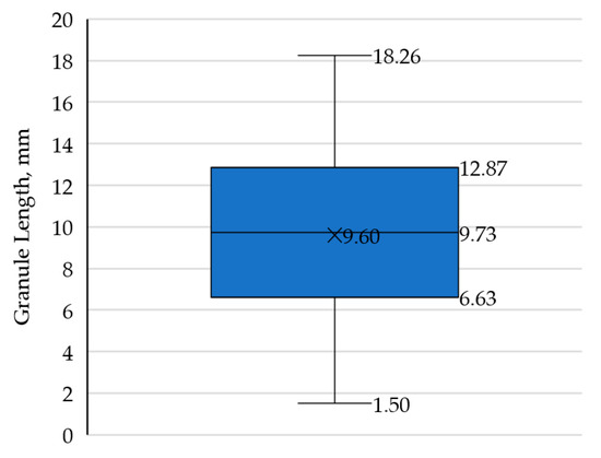 The distribution of the granule length used in the granules-spreading study was quite symmetrical, with Skewness = −0.03. The values of the average and median were close to each other. The histogram of granule length tended to be flat (platykurtic), with a Kurtosis of −0.72. Visually, the resulting distribution of granule lengths was close to the Normal distribution. For the granule-modeling studies, single-sphere, two-sphere, and four-sphere granule models were used with a diameter of 5.49 mm and an average length of the histogram range. The images of the granule models, their shape, length, and percentage of the total volume are presented in Table 4. It is claimed that organic granular fertilizers are spread more uniformly when they have a shorter length (9.50 ± 0.38 mm) and a larger diameter (6.0 ± 0.1 mm). The uniformity of flour fertilizer (lime) is lower compared to the uniformity of incorporation of organic fertilizer granules of cattle manure [17]. The uniformity of liquid fertilizer application is affected by the type of nozzle, the arrangement of the collector, and the concentration of the fertilizer solution [32].